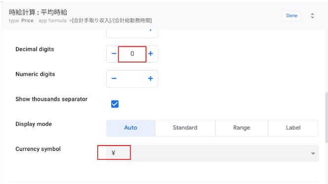 Currency symbolを¥、App formulaに[手取り収入] / [総勤務時間]と入力